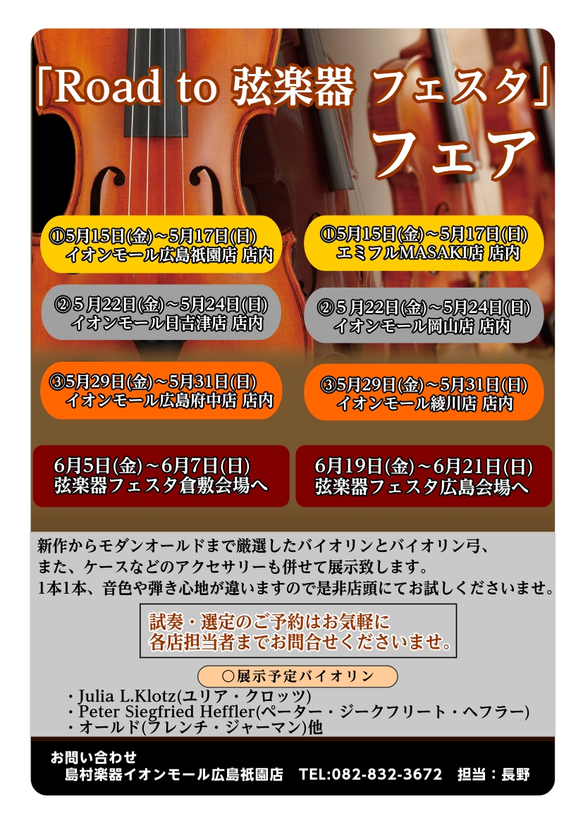 2026年の6月に、イオンモール倉敷店、広島パルコ店にて弦楽器フェスタの開催が決定いたしました。