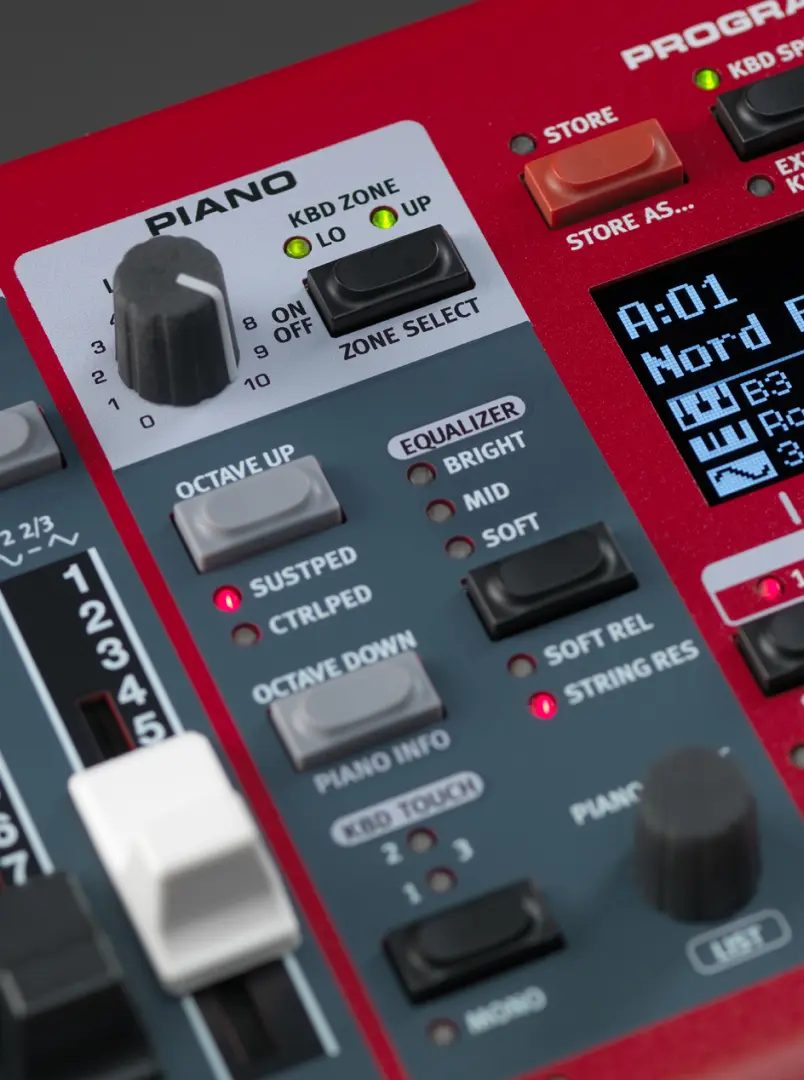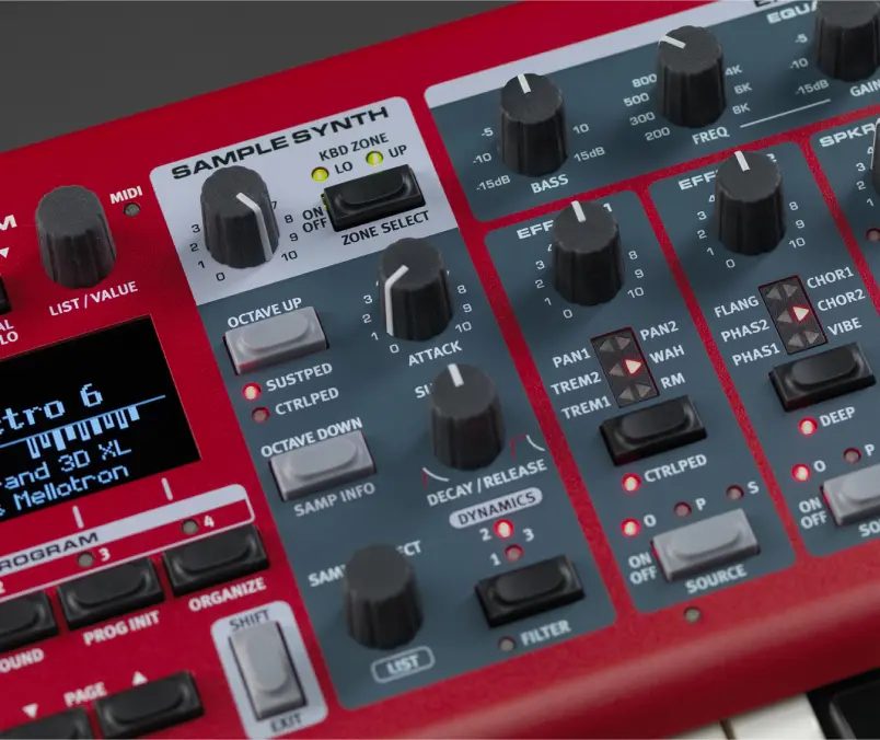 Nordは、セクションごと(Organ / Piano / Sample Synth / Effect)が独立したブロックで配置されており、各セクションは専用ノブ・ボタンで直接操作できる為、メニュー階層を深く潜らなくても音作りしやすい設計となっております。