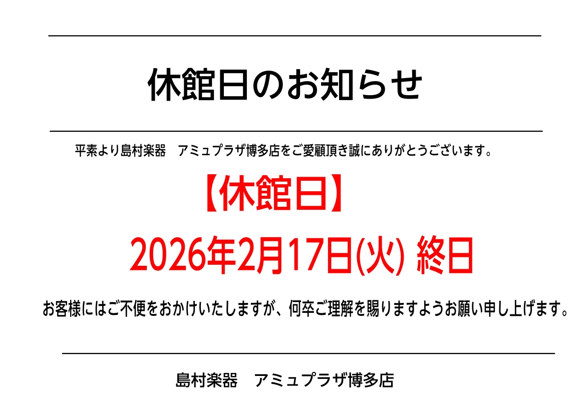 アミュプラザ博多の休館日に伴い、当店も2026年2月17日(火)は休館日とさせていただきます。