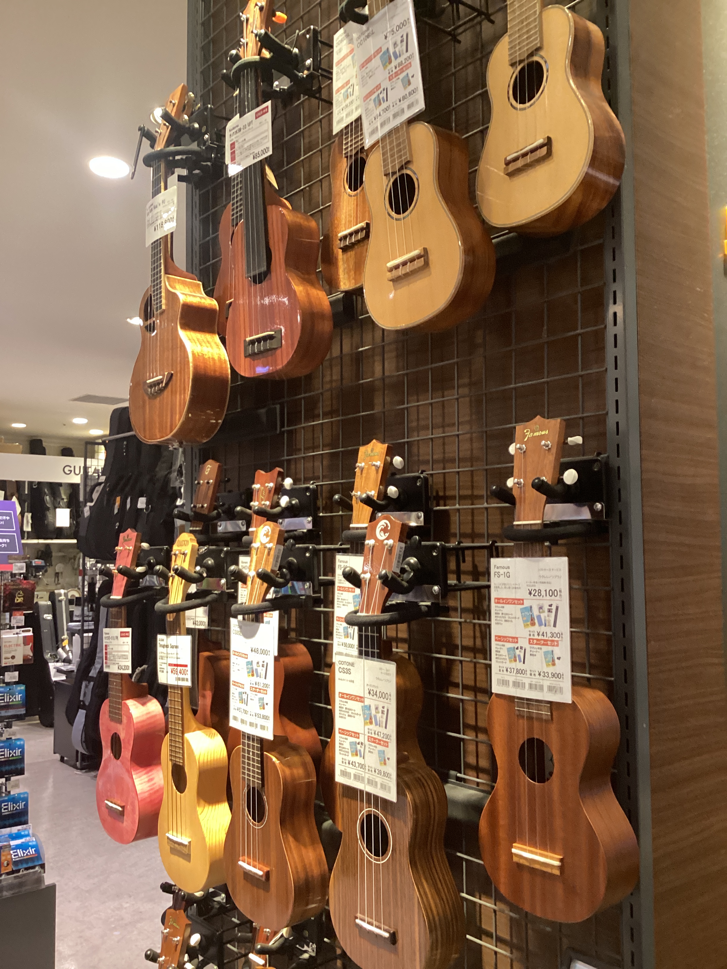 アミュプラザ博多店ではいろんなブランドのウクレレを展示しております。