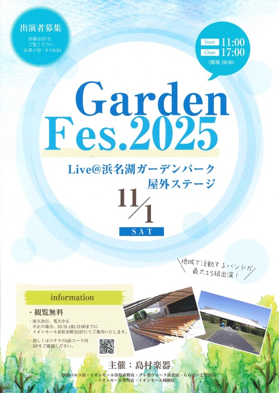 ![皆さんこんにちは!島村楽器イオンモール浜松市野店の天野です! いよいよ明日に迫ってまいりましたGarden Fes.2025!私もワクワクドキドキです! 開催します! 2025年11月1日(土)に控えておりますGarden Fes.2025 予定通り開催いたします!皆様のご来場お待ちしております。  […]](https://www.shimamura.co.jp/shop/hamamatsu/wp-content/uploads/sites/126/2025/10/20251031-20250801-8d52caec13881ed25222d48fcb879659-1.jpg)