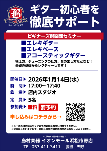 ![CONTENTSビギナーズ倶楽部とはイベント詳細参加方法ビギナーズ倶楽部とは ギター(ベース)初心者のみなさんが感じている悩みや疑問を、店舗にて島村楽器スタッフがわかりやすくレクチャー、サポートいたします。ちょっとした不安がある方はぜひ参加ください。 当店では! ギター初心者のためのサポート動画配信 […]](https://www.shimamura.co.jp/shop/hamamatsu/wp-content/uploads/sites/126/2025/12/20251217-20250116-20220318-bc_thumb-1080x810-1.jpg)