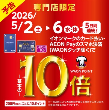【5/2(土)~6(水・休)5日間連続!】専門店限定イオンカードWAON POINT10倍