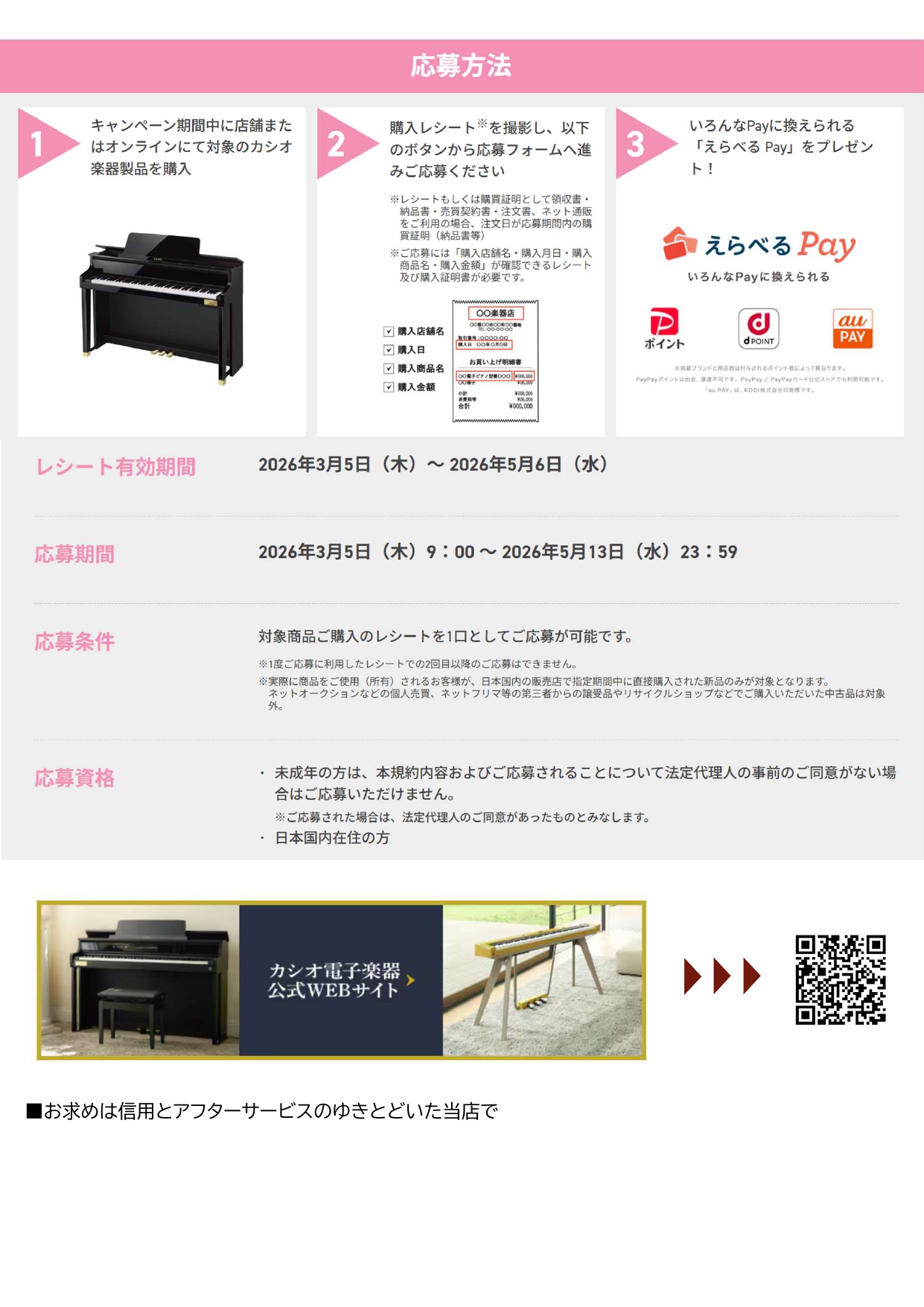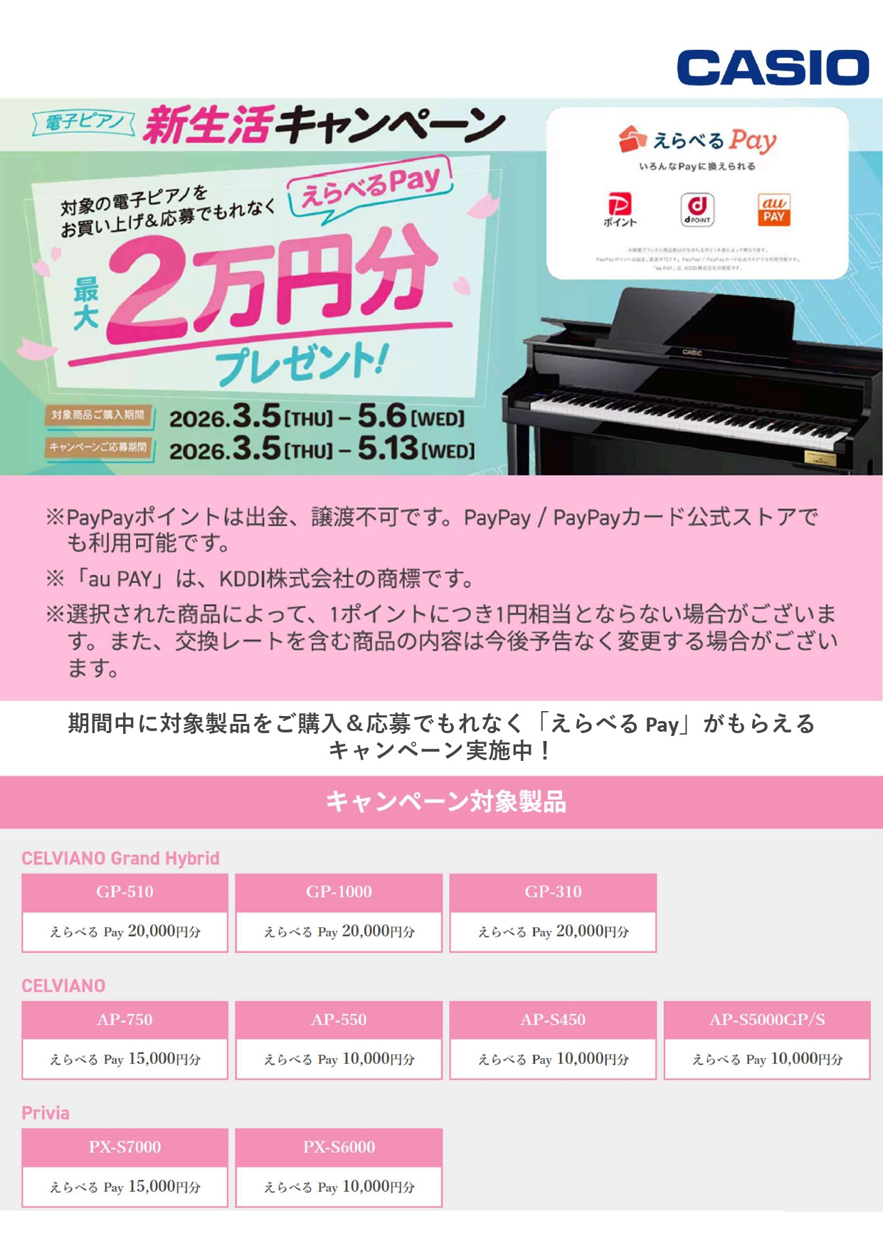 3/5(木)~5/6(水)の期間にCASIOの電子ピアノ対象機種をご成約で交換先を選べる選べるPayをプレゼント