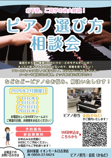CONTENTSピアノアドバイザーのご紹介■2026年2月のピアノ選び相談会開催時間・場所ご来店予約~ご来店までの流れピアノ選びでよくある質問お下見・ご見学のみ大歓迎!ピアノ相談会ではこんなことが解決できます! ピアノをご検討中の皆様、こんなお悩みをお持ちではないですか?・はじめは安いピアノで始めた […]