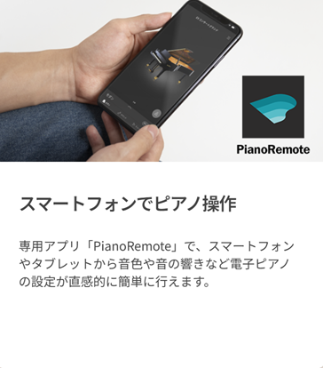 その他、スマートフォンやタブレットで音色や音の響きなど電子ピアノの設定できる専用アプリ「PianoRemote」や、指一本から演奏体験が楽しめる「コンサートマジック」、内蔵されている「レッスン曲」を活用したレッスン機能も充実しています。