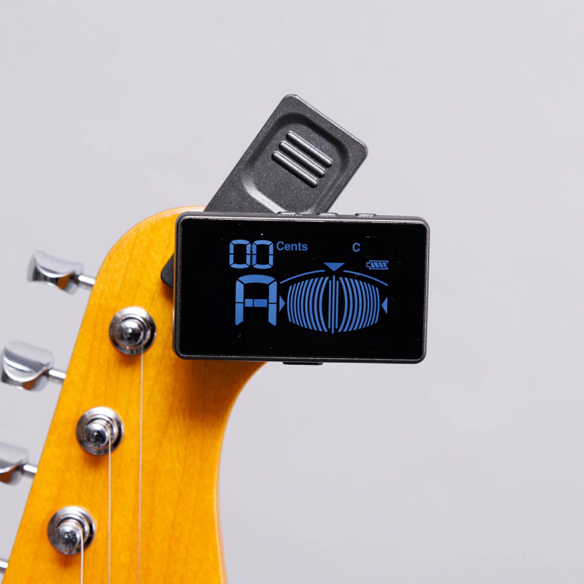 クリップチューナーは上の写真のように、ギターのヘッド部分にとりつけて音を合わせる機械です。