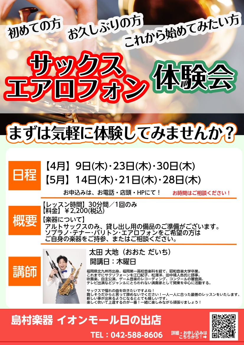 ![こんにちは!島村楽器イオンモール日の出店音楽教室担当の黒沢です。この度、大人気のサックス教室が木曜日に新規開講いたしました!また、今まで多くのお問い合わせをいただいていた、デジタル管楽器(エアロフォン)コースも待望の開講!!!まずは体験レッスンから始めてみませんか? CONTENTS講師紹介レッスン […]](https://www.shimamura.co.jp/shop/hinode/wp-content/uploads/sites/116/2025/05/20250514-order_shima250514-0133_order_pdf_page-0001.jpg)
