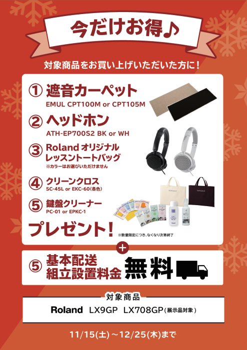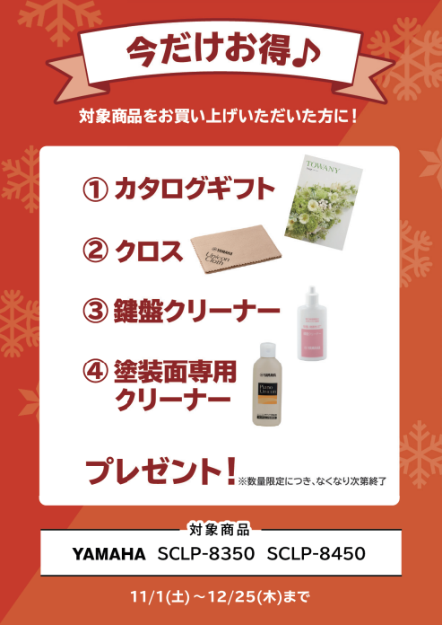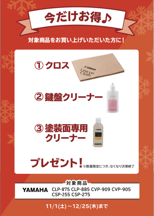 | 特典 | クロス・鍵盤クリーナー・塗装面用クリーナー | クロス・鍵盤クリーナー・塗装面用クリーナー |