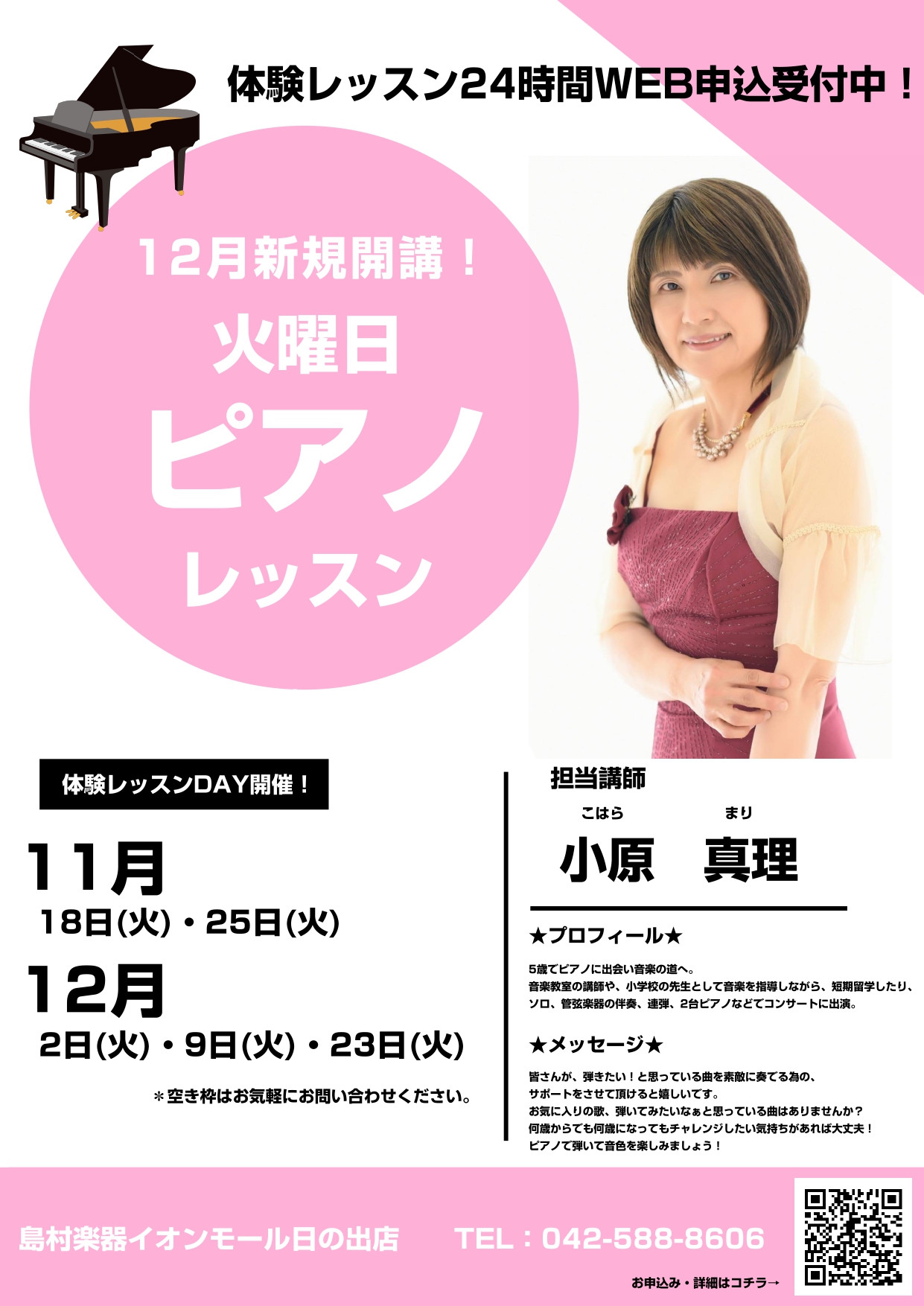 ![こんにちは!島村楽器イオンモール日の出店音楽教室担当の黒沢です。この度、大人気のピアノ教室が木曜日に新規開講いたしました!まずは体験レッスンから始めてみませんか? CONTENTS講師紹介レッスン詳細秋のご入会キャンペーン実施中♪24時間WEB受付中!体験レッスンのお申込みは下記フォームから!お問い […]](https://www.shimamura.co.jp/shop/hinode/wp-content/uploads/sites/116/2025/11/20251116-shima251116-0087.jpg)