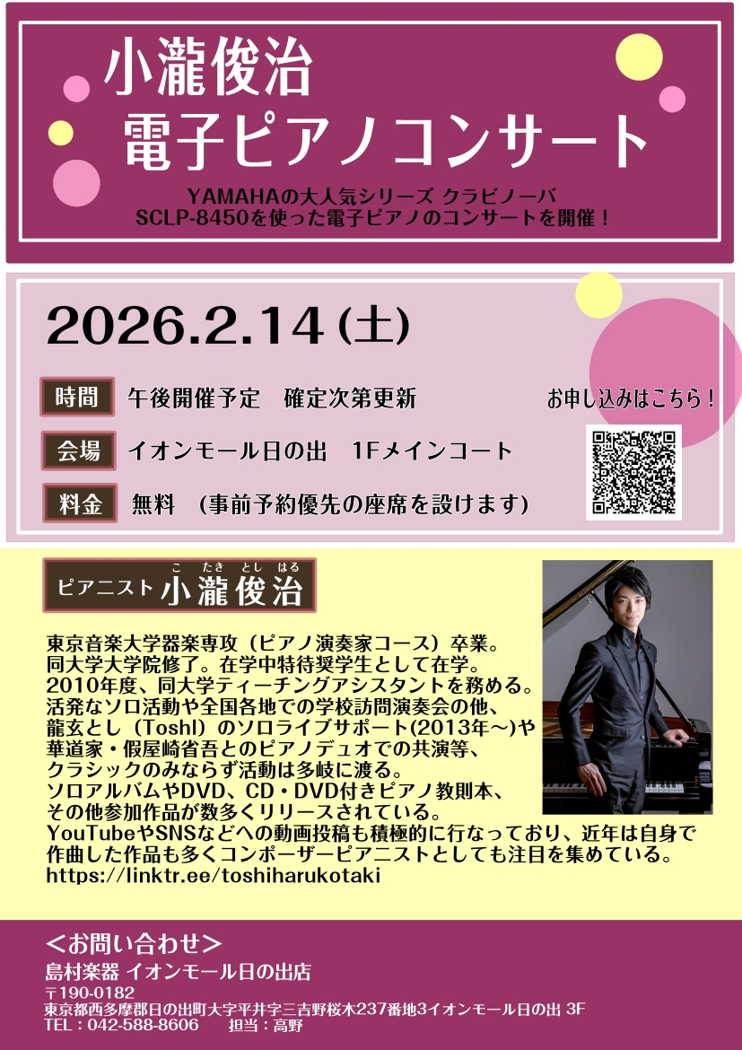ピアニスト小瀧俊治氏による、電子ピアノコンサートの開催が決定しました! YAMAHAの電子ピアノを使ったコンサートを、無料でご覧いただけます。ピアノに興味のある方、電子ピアノをご検討中の方必見です。 座席のご予約も受付中!ご予約、ご来場をお待ちしております。 CONTENTSコンサート詳細小瀧俊治氏 […]