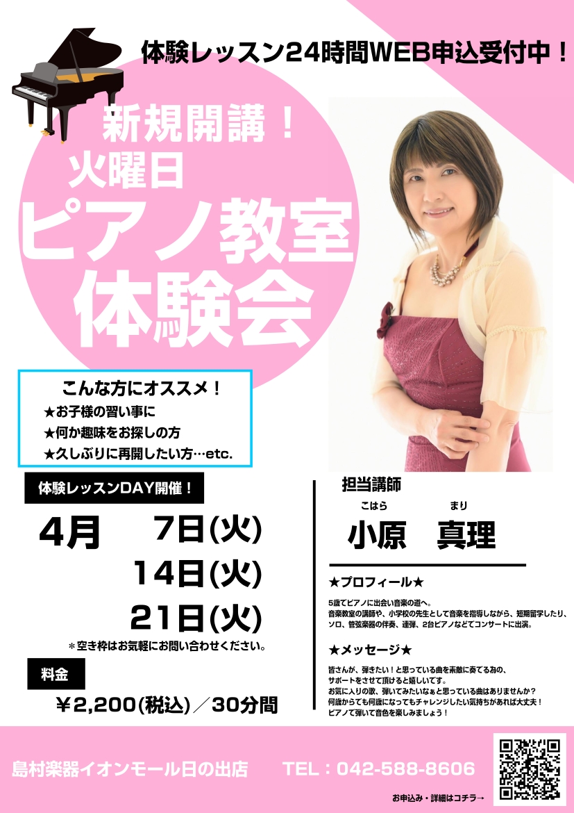 ![こんにちは!島村楽器イオンモール日の出店音楽教室担当の黒沢です。この度、大人気のピアノ教室が火曜日に新規開講いたしました!まずは体験レッスンから始めてみませんか? CONTENTS講師紹介レッスン詳細春のご入会キャンペーン実施中♪24時間WEB受付中!体験レッスンのお申込みは下記フォームから!お問い […]](https://www.shimamura.co.jp/shop/hinode/wp-content/uploads/sites/116/2025/11/20251116-shima251116-0087.jpg)