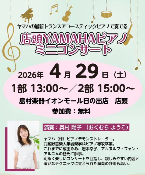 4/25(土)~5/6(水・祝)の期間、島村楽器イオンモール日の出店店内にて「春のピアノ大展示会」を開催!