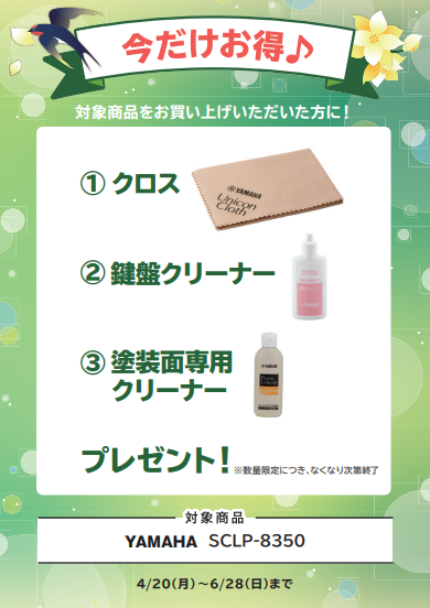 | 特典 | カーペット・クロス・鍵盤クリーナー・塗装面用クリーナー |