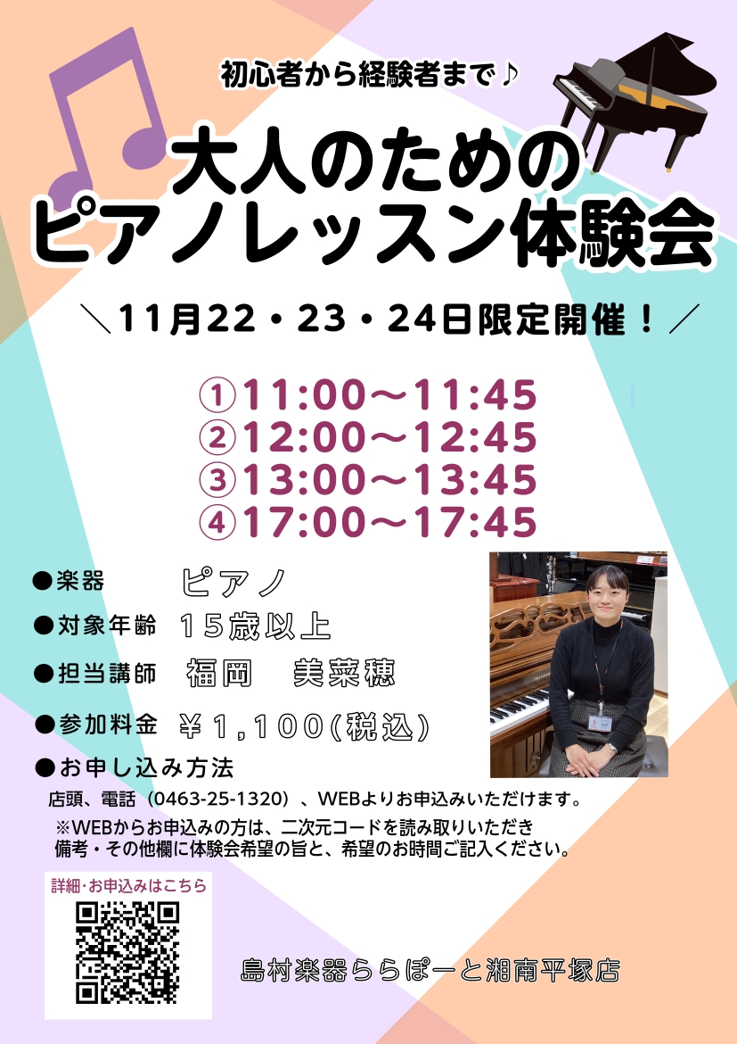 ![CONTENTSレッスン内容について開催日時・参加料金ピアノインストラクターの紹介はコチラからピアノレッスン体験会の申し込み方法インストラクター演奏動画はこちら参加された方の内容紹介お問い合わせレッスン内容について 島村楽器ららぽーと湘南平塚店では、15歳以上の大人のお客様を対象にした予約制ピアノレ […]](https://www.shimamura.co.jp/shop/hiratsuka/wp-content/uploads/sites/166/2025/03/20250317-7cc3a6f40a279703383cfe6551b7cc2b.jpg)