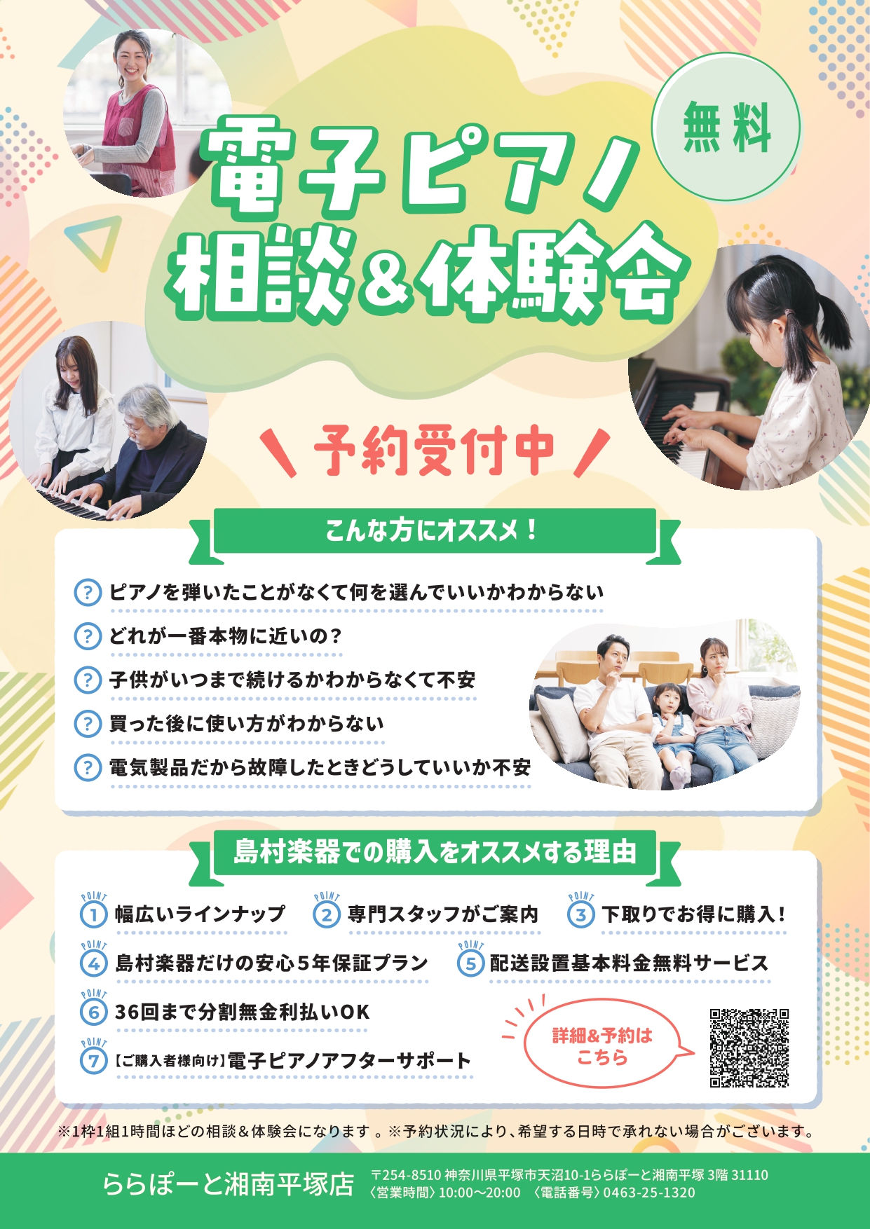 ![日頃の感謝を込めて、島村楽器ららぽーと湘南平塚店では2025年12月26日(金)~2026年1月12日(月・祝)までの期間中、「年末年始ピアノフェア」を開催しております。 「どんなものを買えばいいか分からない…」「メーカーごとにどんな違いがあるの、、?」そんなお客様の用途にピッタリの電子ピアノを、タ […]](https://www.shimamura.co.jp/shop/hiratsuka/wp-content/uploads/sites/166/2025/12/20251227-c8334fa179cb114cca178bd5f12bec08.jpg)