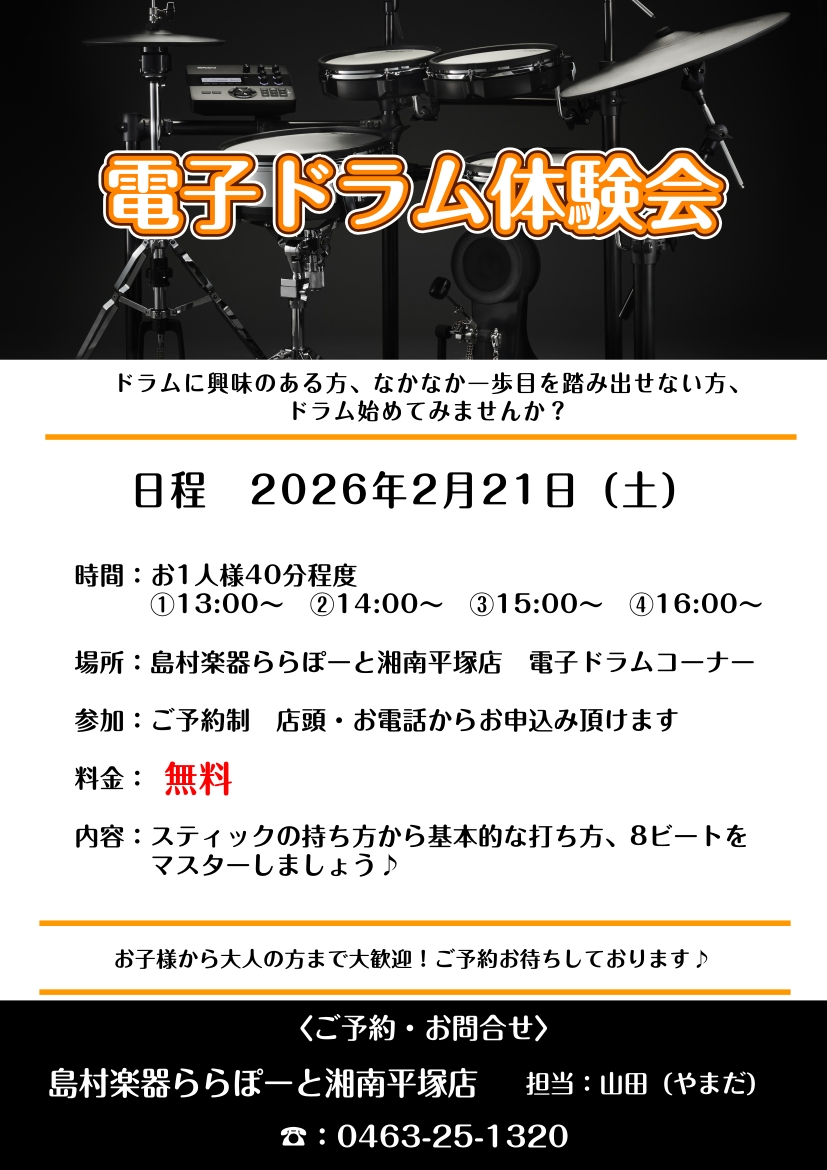 ![こんにちは!島村楽器ららぽーと湘南平塚店の山田(やまだ)です。 2026年2月21日(土)に電子ドラム体験会を開催いたします! 「ドラムに興味があるけど叩いたことがない、、。」「「これからドラムを始めるけど不安、、」 「電子ドラムってアコースティックドラムとなにが違うの?」「電子ドラムの価格による違 […]](https://www.shimamura.co.jp/shop/hiratsuka/wp-content/uploads/sites/166/2026/01/20260108-d5bc3b4d83d135ee6705034c8c8a89d1.jpg)