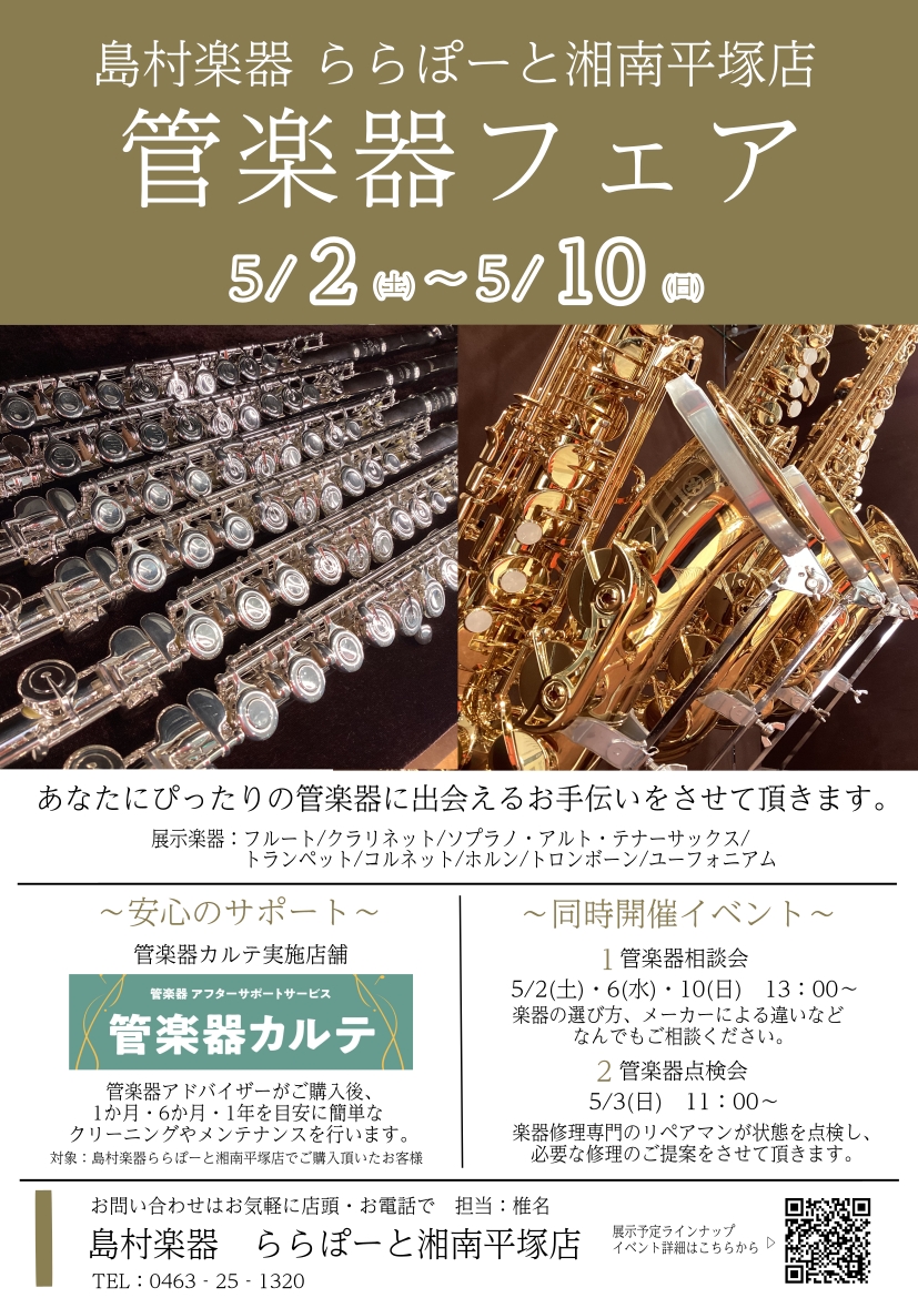 この度、ららぽーと湘南平塚店で2026年5月2日(土)~5月10日(日)管楽器フェアを開催いたします!