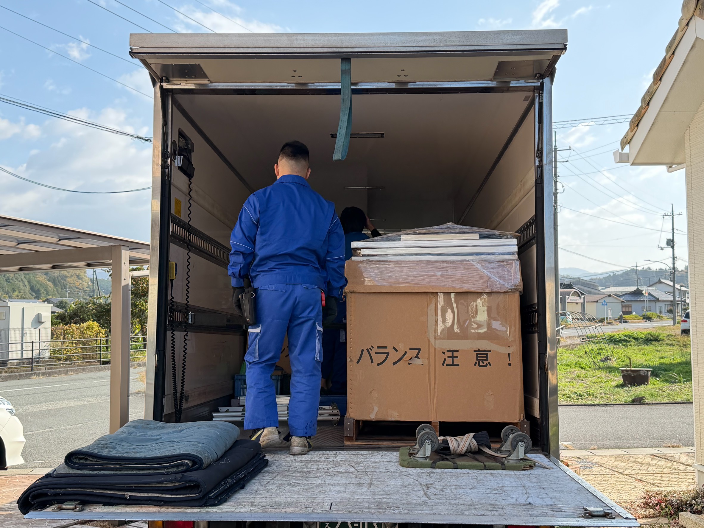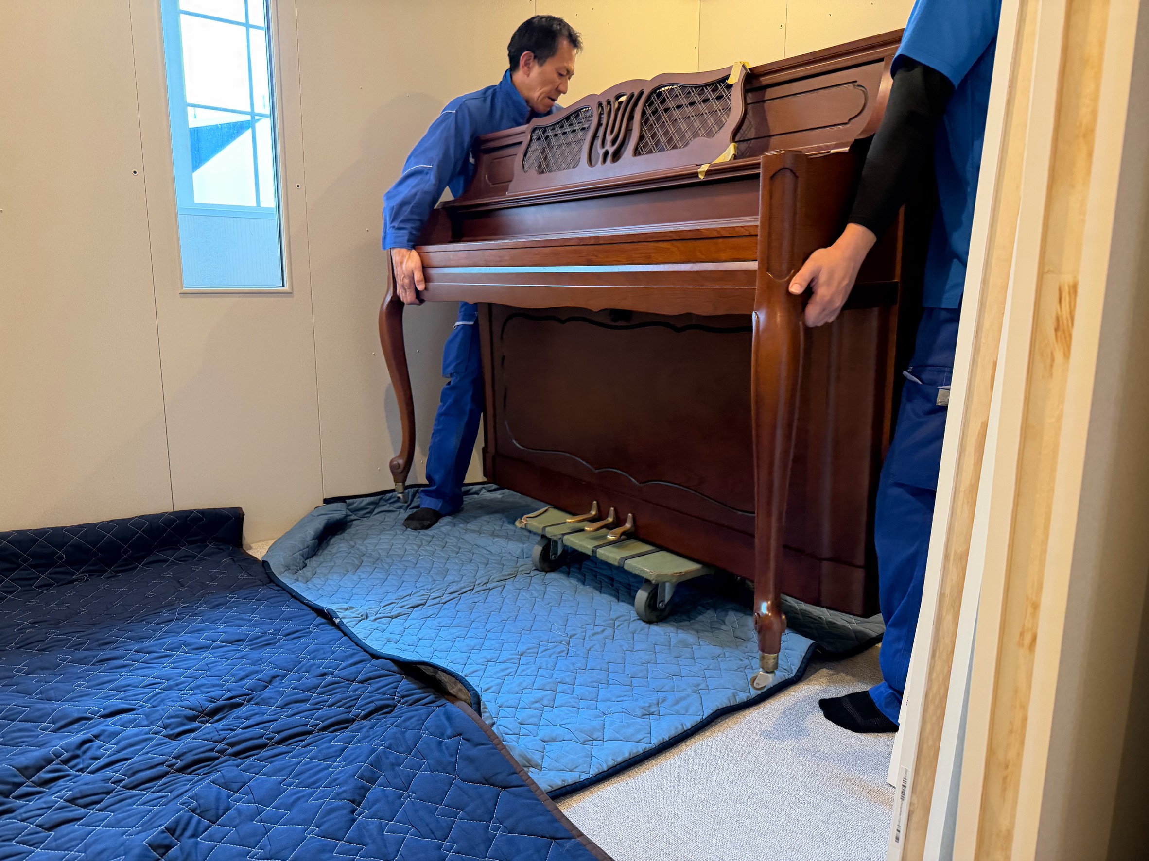ピアノも慎重に運搬します。ニシリク様はピアノ配送もお手のもの。
