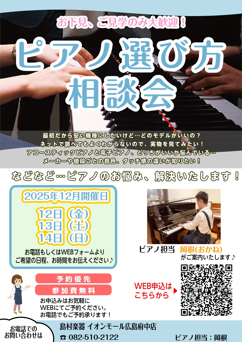 ![CONTENTSお下見・ご見学のみ大歓迎!ピアノ相談会ではこんなことが解決できます!ピアノアドバイザーのご紹介ピアノ選び方相談会はこんな良いコトがあります!ご予約方法相談会の流れ開催日時同時開催!イオンカードご決済によるキャンペーンお下見・ご見学のみ大歓迎!ピアノ相談会ではこんなことが解決できます! […]](https://www.shimamura.co.jp/shop/hiroshimafuchu/wp-content/uploads/sites/141/2025/06/20251001-72a759710a287f6988adc78c1bbe17b0.jpg)