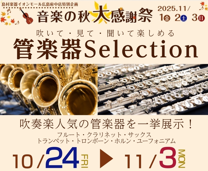 ![島村楽器広島府中店にて、11/1(土)~11/3(月)までの期間限定で、国内外の一流ブランドのハイエンドモデルまでを一挙に展示する「秋の管楽器フェア」を開催いたします。 これから始められる方から、プロユースまで多くのお客様に楽しんで頂けるフェアとなっております。 幅広いラインナップの中から、お客様の […]](https://www.shimamura.co.jp/shop/hiroshimafuchu/wp-content/uploads/sites/141/2025/10/20251017-shima251017-0179-2-1.jpg)