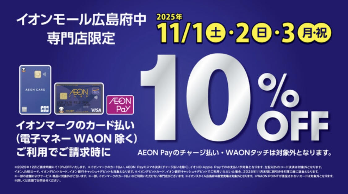 11/3~11/3の間、イオンカードでご決済頂くと請求時10%OFFになります!