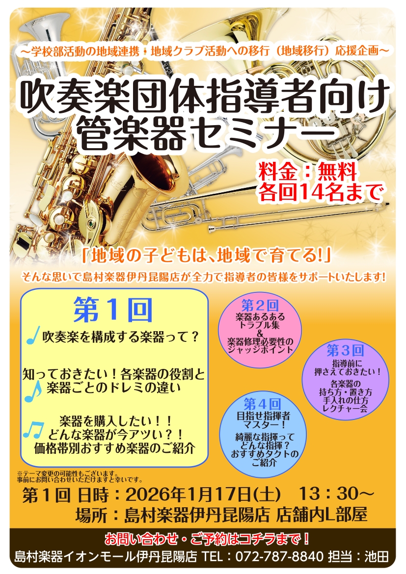 記事を見ていただきありがとうございます♪管楽器担当の池田です! 日頃より島村楽器イオンモール伊丹昆陽店をご愛顧いただきありがとうございます。 タイトルにもございますように2026年1月17日に『吹奏楽団体指導者向け管楽器セミナー』を実施いたします☆彡 昨今話題に上がっている学校部活動の地域連携・地域 […]