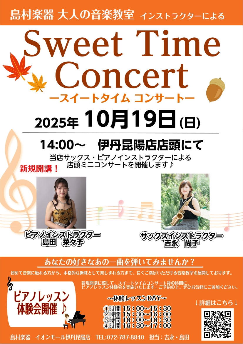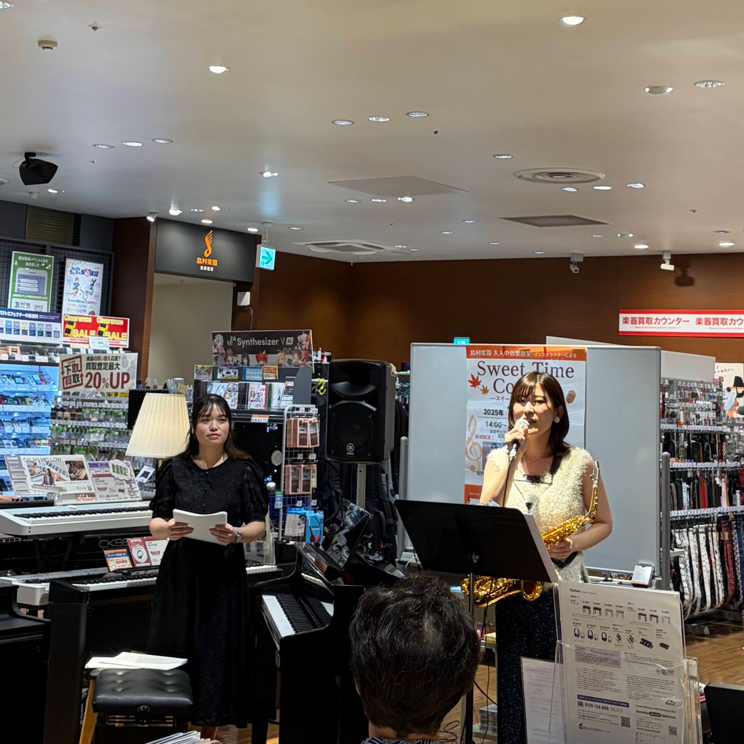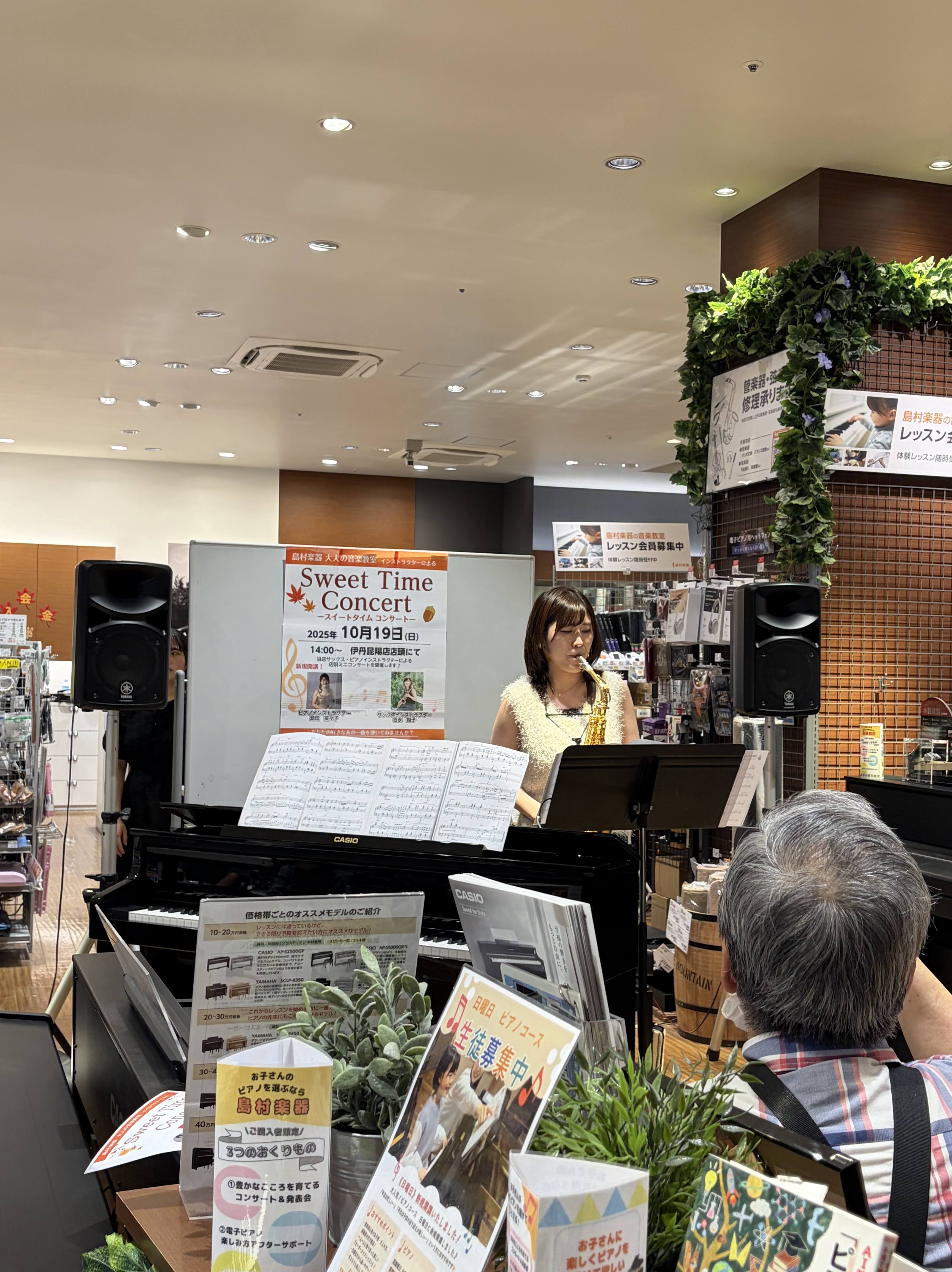 ![皆さんこんにちは!ピアノインストラクターの島田です。先日、当店インストラクターによる『Sweet Time Concert』を開催いたしました♪ 出演者紹介 今回は、当店ミュージックサロンインストラクター2名による演奏をお届けしました。 コンサートスタート♪ 1曲目は、サックスインストラクター吉永に […]](https://www.shimamura.co.jp/shop/itamikoya/wp-content/uploads/sites/145/2025/10/20251024-img_3508-2.jpg)