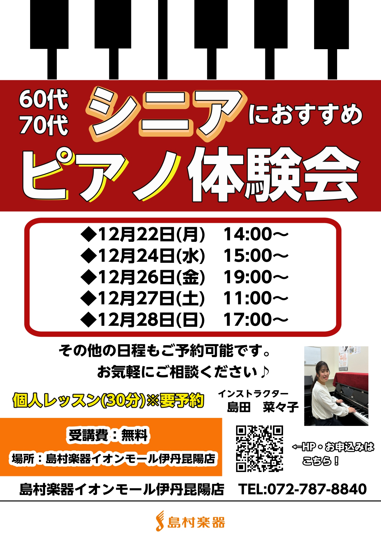 ![皆さんこんにちは!ピアノインストラクターの島田です。ピアノを始めるのに年齢は関係ありません。60代、70代でピアノを始める方が増えています!初めての方も安心してお通いいただけますので、ぜひお気軽にお問い合わせください。 まずは無料のレッスン体験会でピアノに触れて、一緒に楽しみませんか? CONTEN […]](https://www.shimamura.co.jp/shop/itamikoya/wp-content/uploads/sites/145/2025/12/20251208-38ef257ae67347d263815cb9f31266a7-2.jpg)