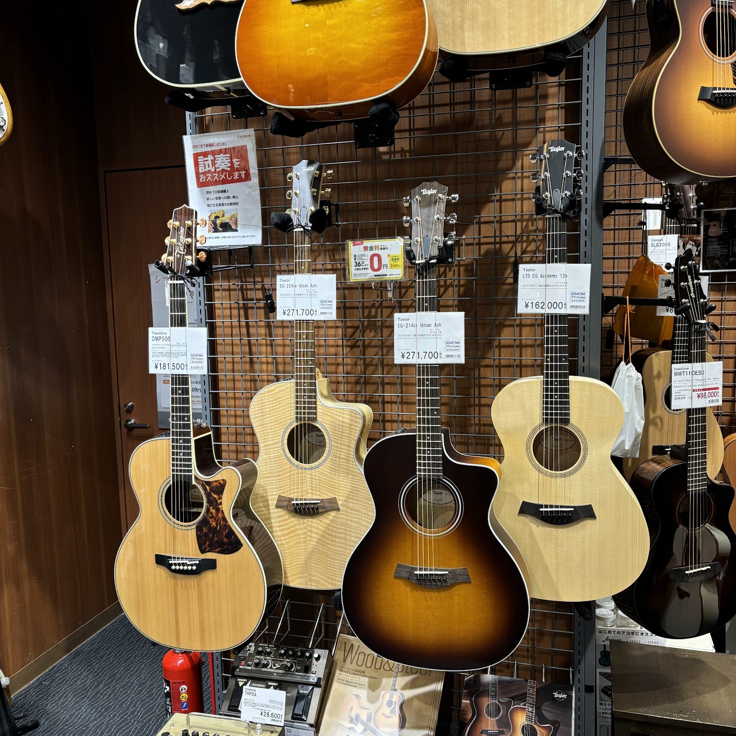 高いギターが必ずしも良いというわけではございませんが、お値段が上がるとそのギターにしか出せない音がして、弾き手の演奏意欲を刺激してくれます。「高いから買う予定がない…」という方や「まだステップアップ中だから…」と試奏を躊躇っている方も、まず触ってみてどんな音がするのか体感してください!!