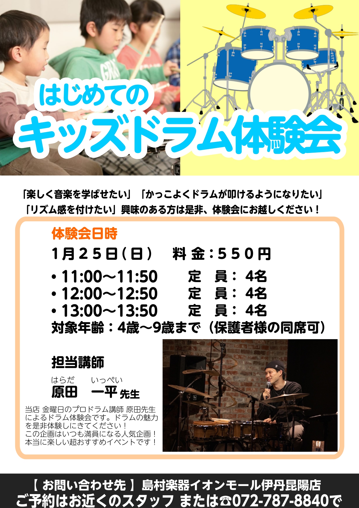 ![右手、左手、右足、左足がバラバラに動いてて難しそう、、、と感じられている方も多いかと思いますが、実は基礎のビートが身に付けば、楽曲の6~8割は叩けてしまう!そんな楽器がドラムです!しかも基礎のビートは、正しく練習していけば、、、絶対にできます!!ドラムはかっこいいだけではなく、「脳全体の活性化」「集 […]](https://www.shimamura.co.jp/shop/itamikoya/wp-content/uploads/sites/145/2025/12/20251229-drum.jpg)