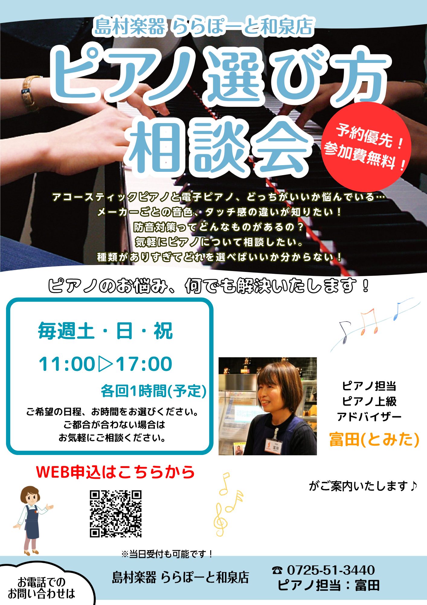 ご希望の日時が迫っている場合は、ピアノ担当富田(とみた)宛にお電話にてお問い合わせ頂けますとスムーズにご案内できます。