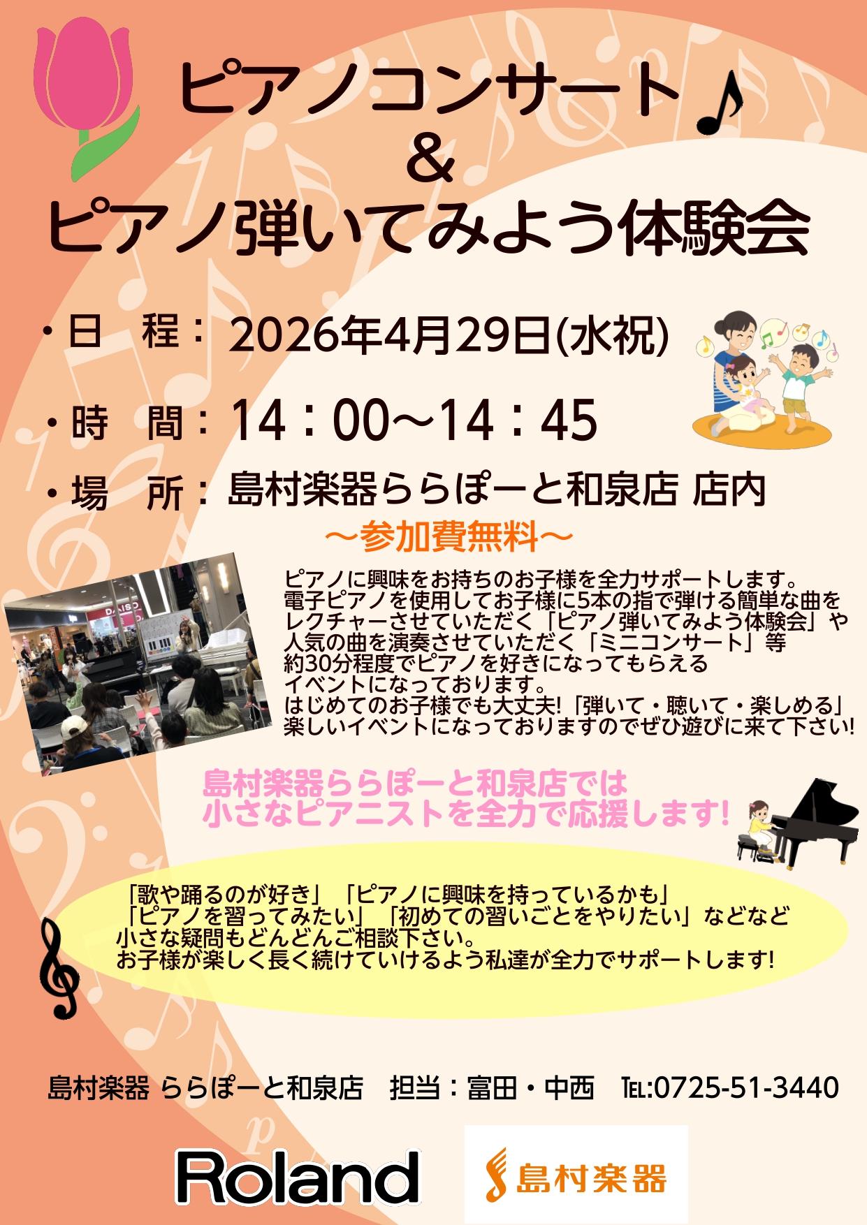 島村楽器ららぽーと和泉店 ピアノ担当の富田(とみた)です! 4/29(水・祝)に、「ピアノコンサート♪&ピアノ弾いてみよう体験会」を開催いたします🎹 たくさんの方のご参加お待ちしております! CONTENTS「 ピアノコンサート♪&ピアノ弾いてみよう体験会」って何?開催日・お問い合わせ先私たちがご案 […]