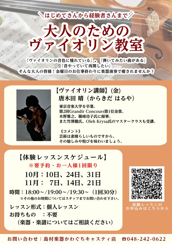 こんにちは!かわぐちキャスティ店弦楽器担当 尾崎です。 「ヴァイオリンの音色に憧れている」、「弾いてみたい曲がある」、「昔ヴァイオリンをやっていて再開したい」・・・ そんな大人の皆様!ぜひ当店のヴァイオリン教室で、唐木田先生と一緒にヴァイオリン演奏を楽しみませんか? 金曜日の夜、お仕事帰りにもお通い […]