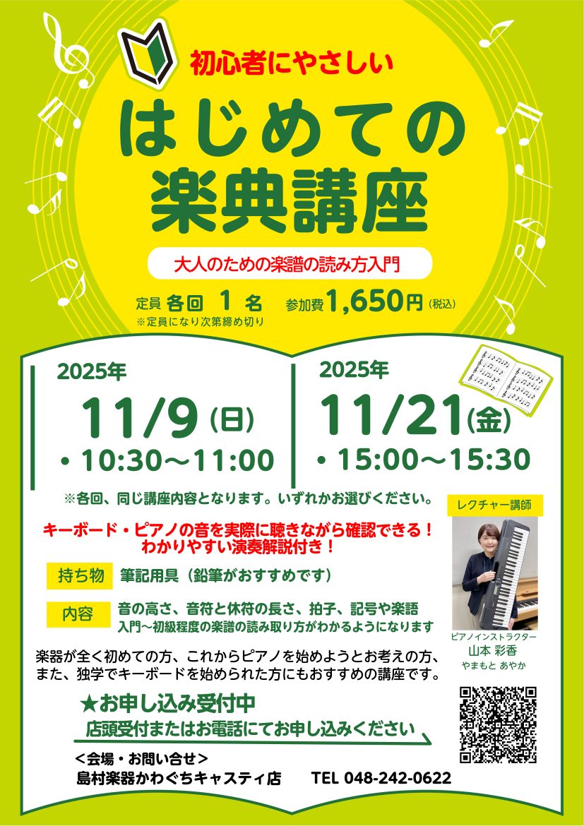 ![皆さま、こんにちは。島村楽器かわぐちキャスティ店:ピアノ・キーボードインストラクターの山本(やまもと)です。 ・ピアノやキーボードの演奏に憧れている・ピアノを始めてみたいけれど、楽譜が読めないからレッスンについていけるか不安 そんな方におススメの1回完結型の講座で、楽譜の読み方の優先ポイントをお届け […]](https://www.shimamura.co.jp/shop/k-casty/wp-content/uploads/sites/94/2025/09/20250911-578379234117681239.jpg)