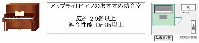 | アップライトピアノ (2.0畳~2.5畳) ホルン / ユーフォ / チューバ | 2.0~2.5畳以上 | Dr-40 | 6.0畳 | 大きめのお部屋前提。戸建てやマンション6畳広めの間取り向け |