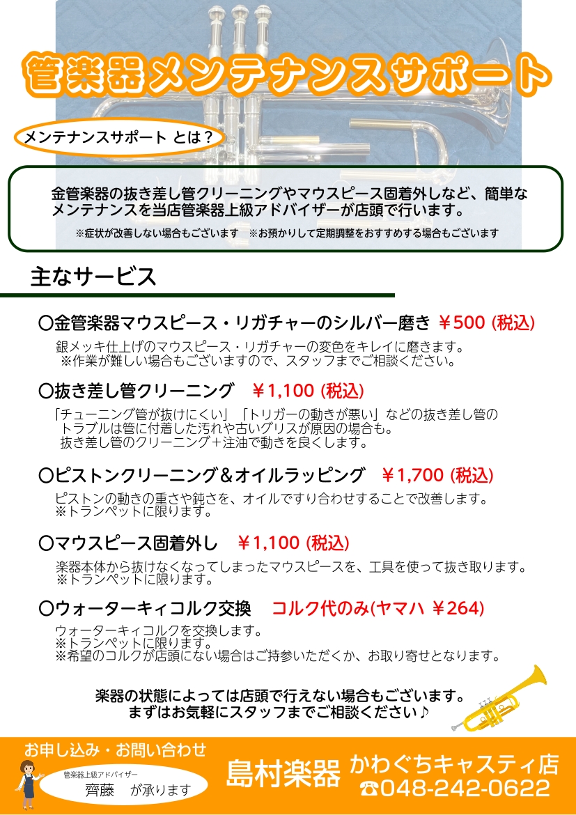 ![CONTENTSメンテナンスのご案内店頭でできるメンテナンス実践!担当スタッフお問い合わせメンテナンスのご案内 こんにちは!管楽器アドバイザーの齊藤です!かわぐちキャスティ店では店頭でトランペット・フルート・クラリネット・サックスのメンテナンスを行っております。最初に必要なメンテナンス用品がわからな […]](https://www.shimamura.co.jp/shop/k-casty/wp-content/uploads/sites/94/2025/08/20250814-0dd7452c560ea98c4c22caac04fe1516.jpg)