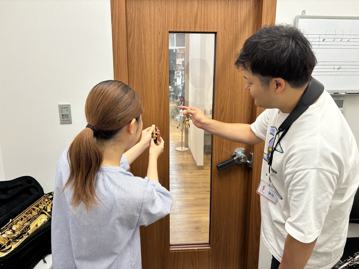 まずはマウスピースにリードを付ける所から教えてもらいました。リードの上にマウスピースの先端が髪一本分見えるようにと分かりやすく教えてもらいました。