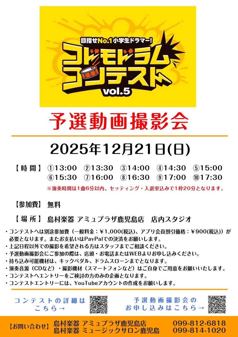 ![鹿児島の小学生ドラマーの皆様!コドモドラムコンテスト沖縄地区大会が2026年の2月8日(日)、北部九州地区大会が2026年2月15日(日)に開催されます!エントリー期間は2025年11月1日(土)~2026年1月12日(月・祝)です! ドラムを習っている方!自宅にドラムがあって楽しまれている方!!ぜ […]](https://www.shimamura.co.jp/shop/kagoshima/wp-content/uploads/sites/76/2025/12/20251207-4a332f05ade4ac7bb3c46c472cb5eac8.jpg)