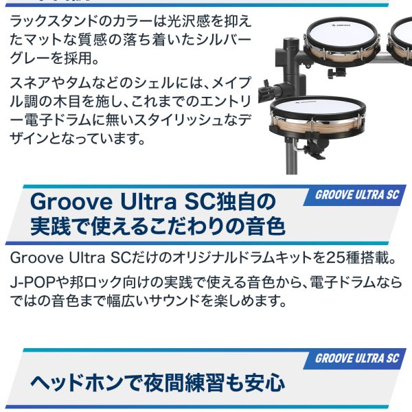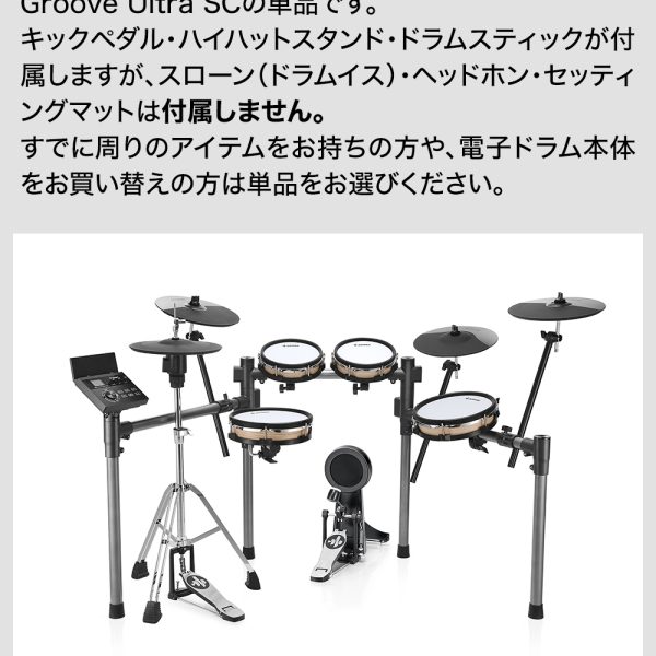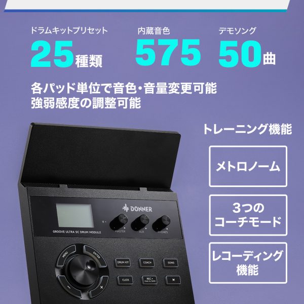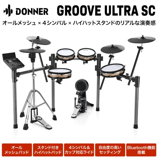 Donnerの「Groove Ultra SC」は、オールメッシュパッドや独立ハイハットスタンドを備えた本格仕様。