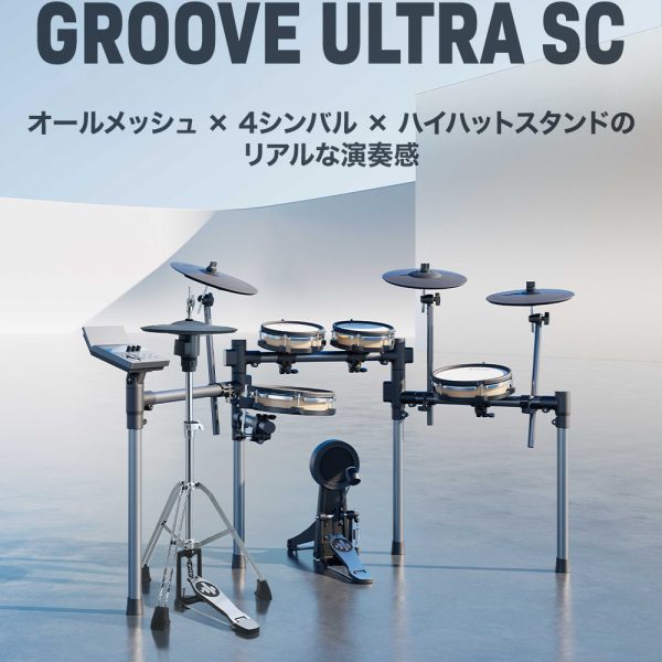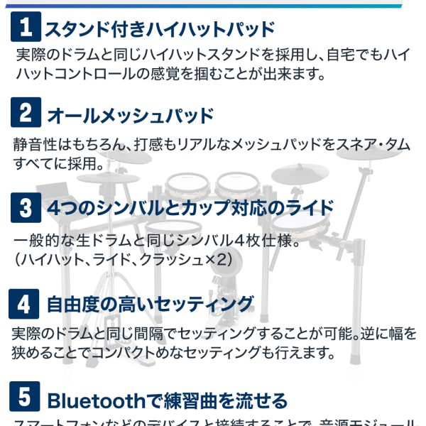 シンバルは 4 枚構成で、生ドラムと同じ感覚の演奏体験を実現。