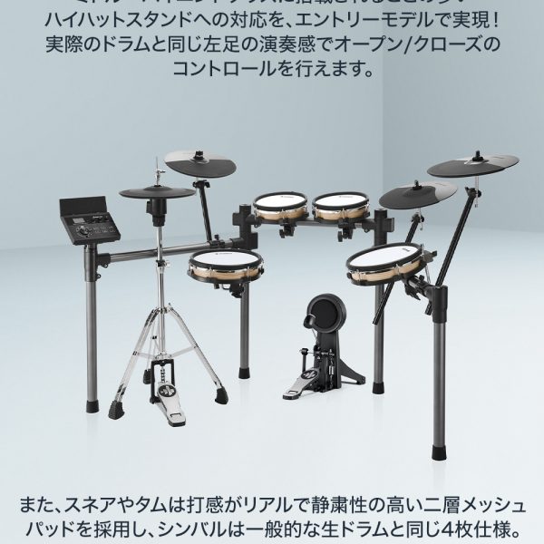 ハイハット用スタンドを備え、左足の操作から「オープン/クローズ」までリアルに再現。