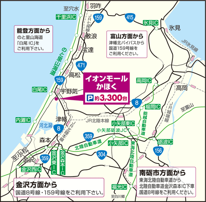 金沢市からイオンモールかほく店へのアクセス