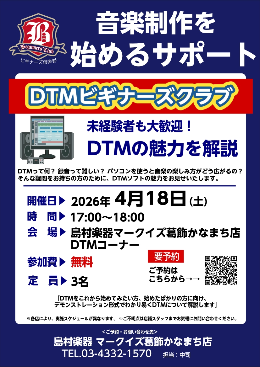 ![マークイズ葛飾かなまち店には葛飾区(金町・新宿・水元)だけでなく、松戸市(松戸)にお住まいのお客様にもご来店いただいております。「DTMを始めようとソフトの、使い方がわからない…」「始める為には何が必要??」 そんな初心者の方のお悩みや疑問を、島村楽器スタッフ […]](https://www.shimamura.co.jp/shop/kanamachi/wp-content/uploads/sites/216/2026/02/20260209-shima260209-0078.jpg)