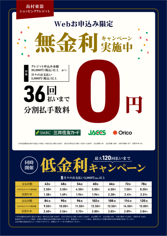 島村楽器でのお買い物では、36回払いまで分割手数料無料!