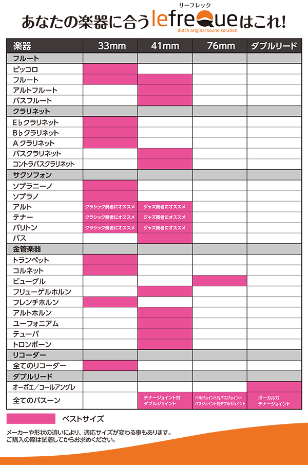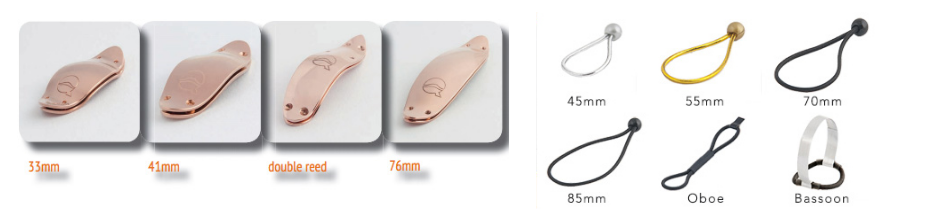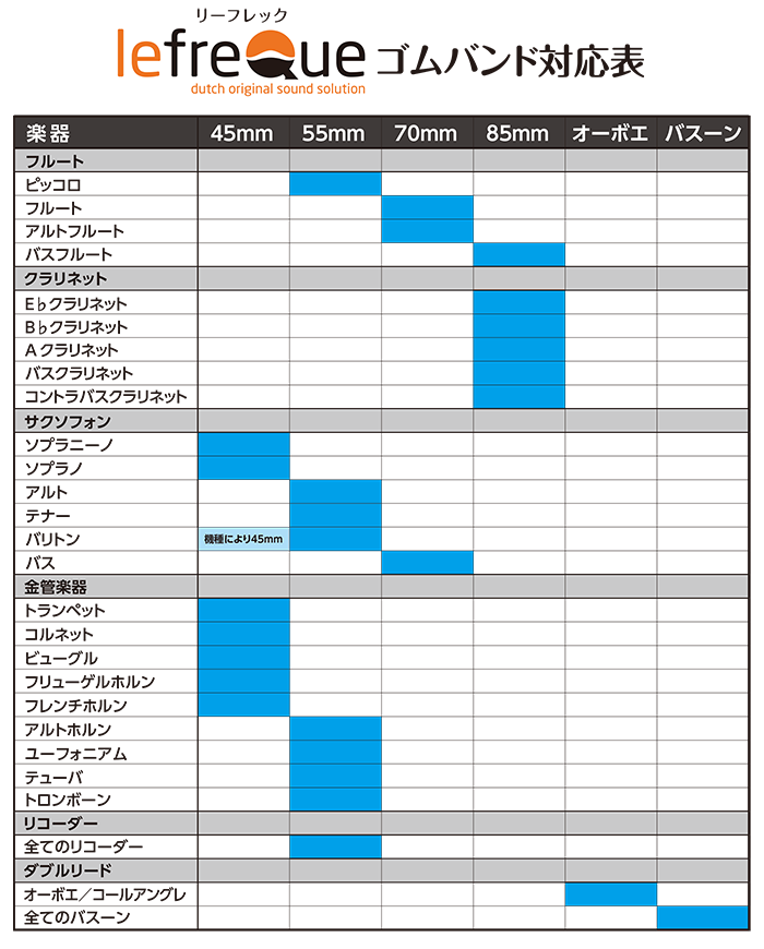 lefreQueと固定用ゴムバンドは大きく分けて4種類。※オーボエとファゴットは専用の固定用ゴムバンド有