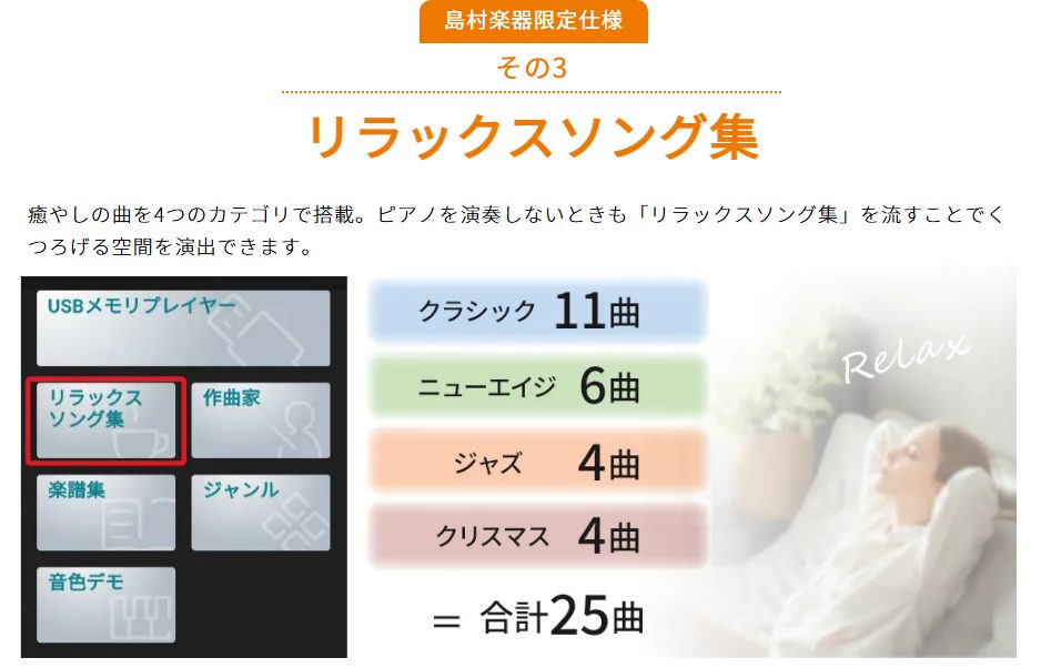 内蔵曲 :全293曲(デモソング18曲 レッスン200曲、コンサートマジック50曲、リラックスソング25曲)