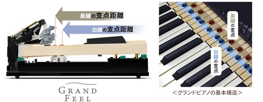 すべて同じ支点距離では黒鍵の奥側を弾くときのみ不自然に重くなってしまいます。それぞれ異なる支点距離にすることで、白鍵と黒鍵を行き来するパッセージも自然な演奏を実現しました。