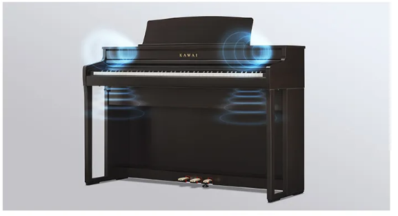 正面に2つ、下向きに2つ、合計4つのスピーカーを搭載。正面の5cmコーンツィーターがピアノの上から聞こえる音を再現し、下向きのスピーカーは傾斜型に変えたことにより音の広がりを再現、グランドピアノのような繊細な高音と深い中低音の響きを実現しました。