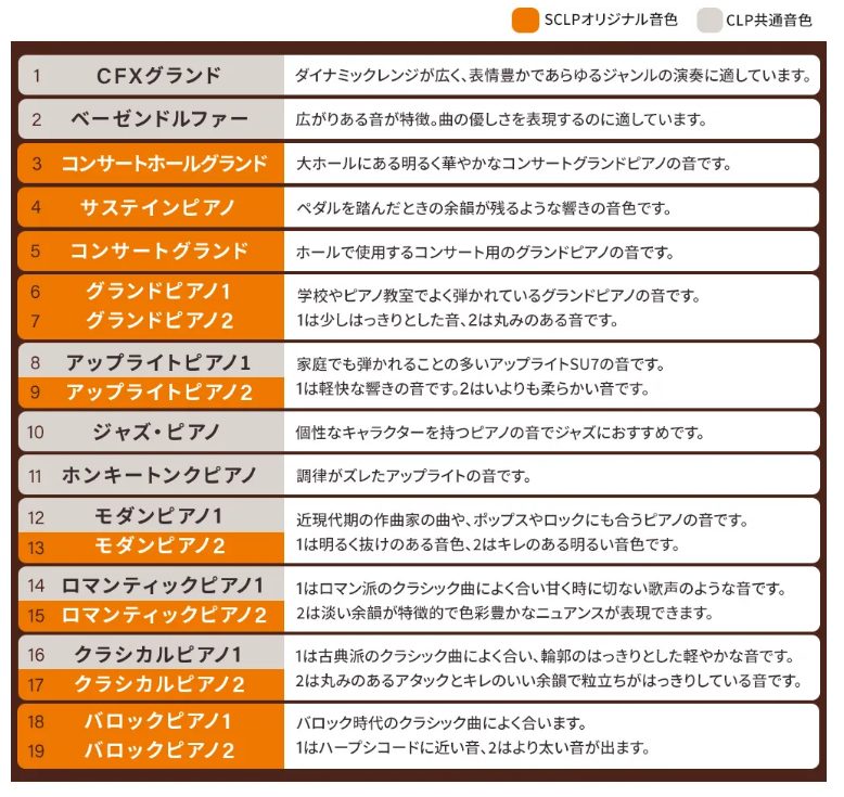 19種のピアノ音色